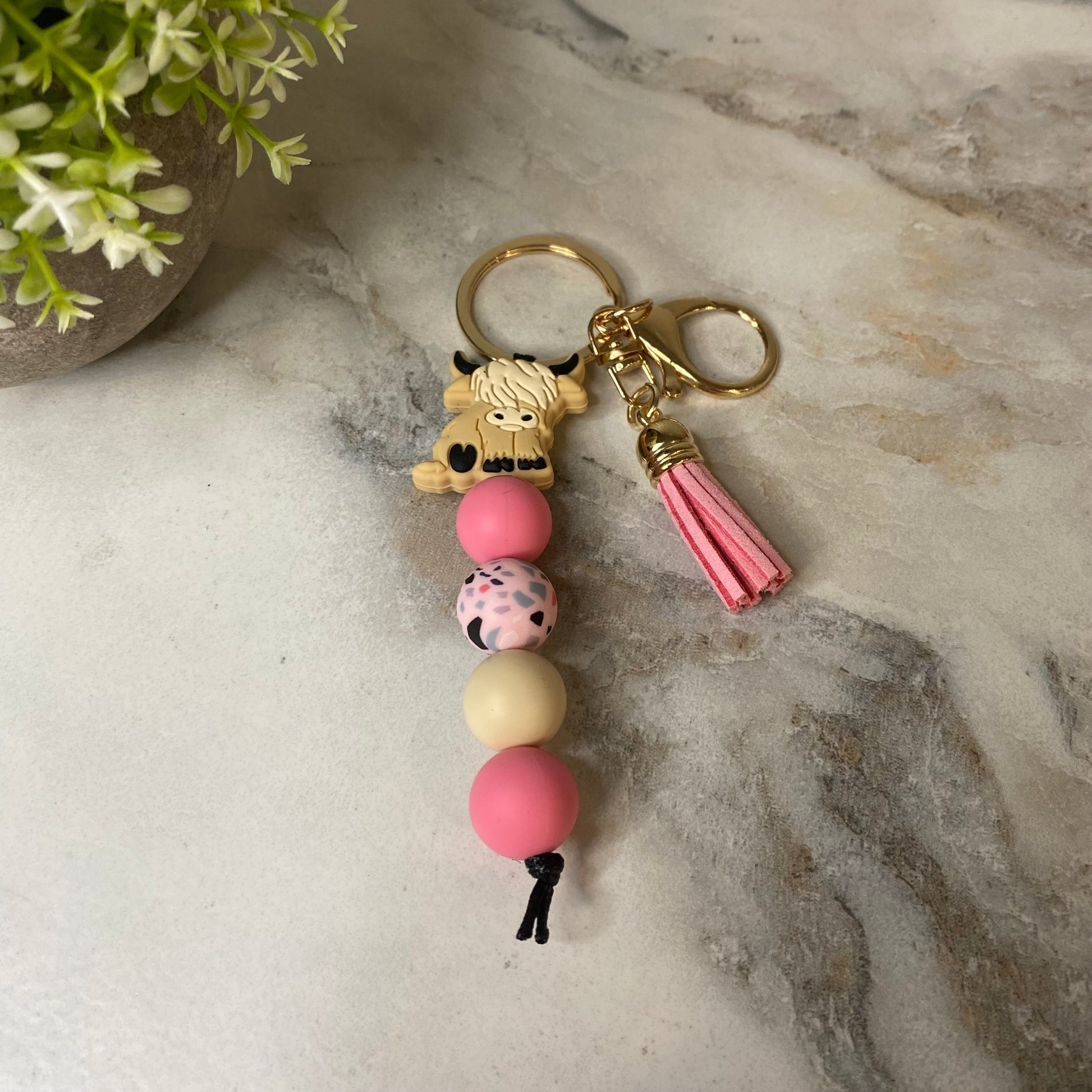 This adorable keychain holds so many cute beads and is approximately 3.5” long plus a gold clip and tassel