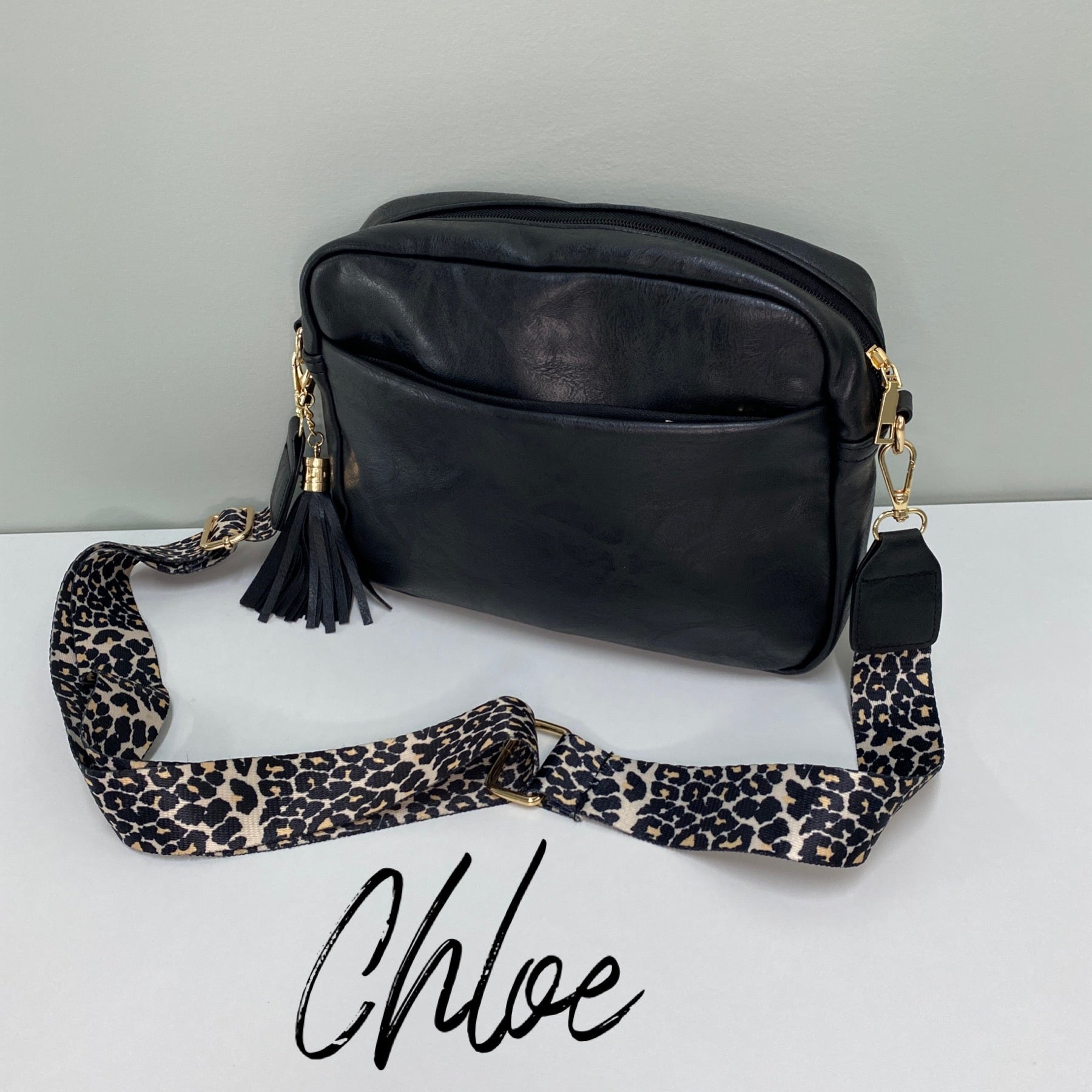 They feature 1 main zip compartment, as well as a front zip pocket for securely storing items! Make it a purse, travel bag, and so much more. Also comes with an animal print shoulder/crossbody strap.